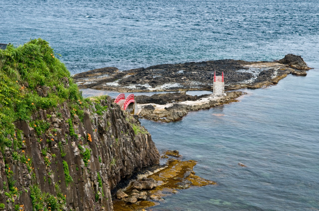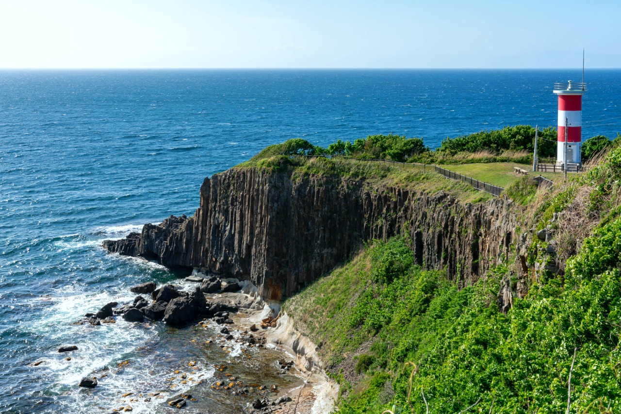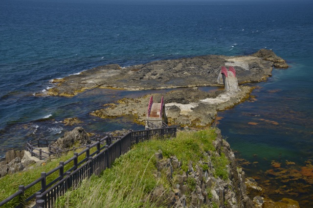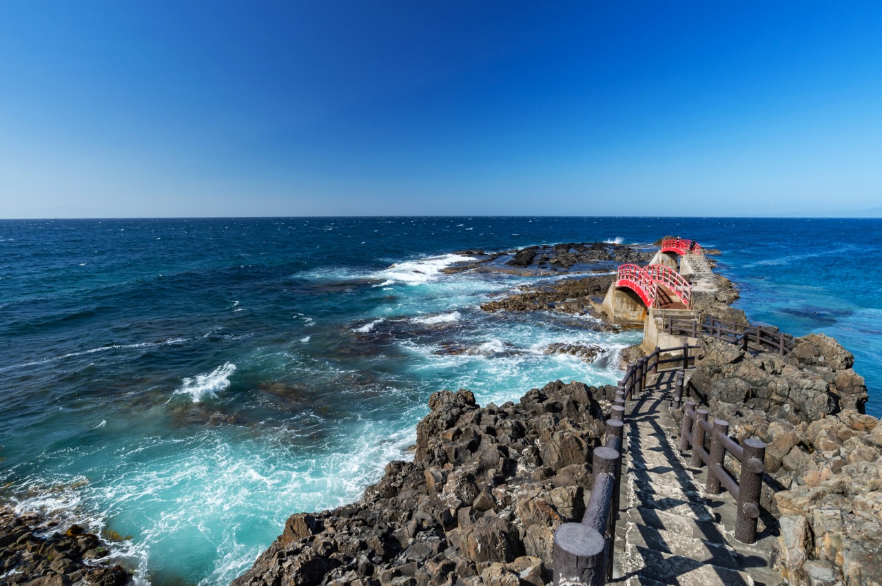 岬の先端には赤と白の灯台があり、その先を下っていくと岩場と岩場をつなぐ「潮騒橋」と「渚橋」という2本の赤い橋が。このふたつの橋を歩いて渡ると先端の岩場まで行くことができ、そこから見る景色はまさに絶景。潮風に吹かれながらどこまでも広く青い海を望めます。