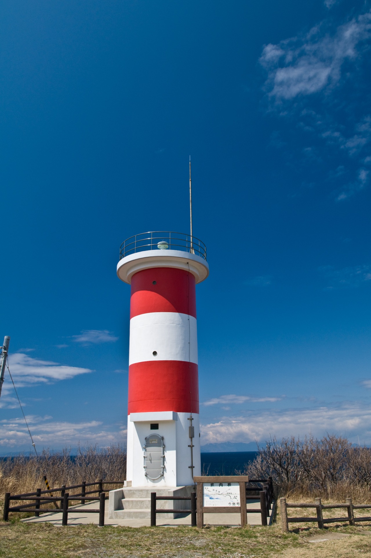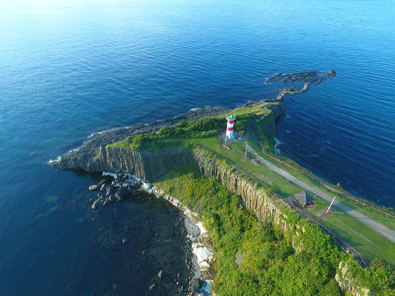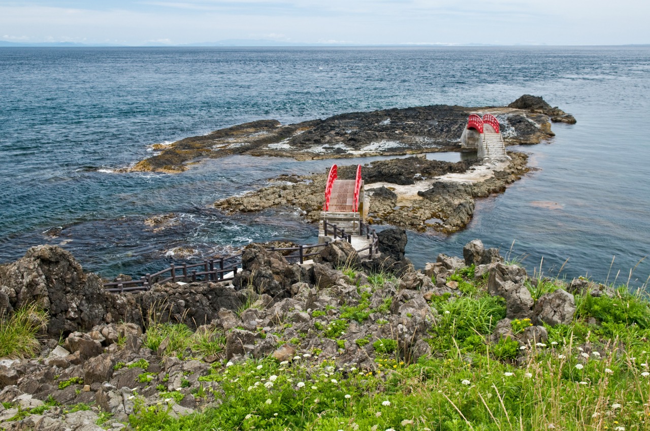 岬の先端には赤と白の灯台があり、その先を下っていくと岩場と岩場をつなぐ「潮騒橋」と「渚橋」という2本の赤い橋が。このふたつの橋を歩いて渡ると先端の岩場まで行くことができ、そこから見る景色はまさに絶景。潮風に吹かれながらどこまでも広く青い海を望めます。